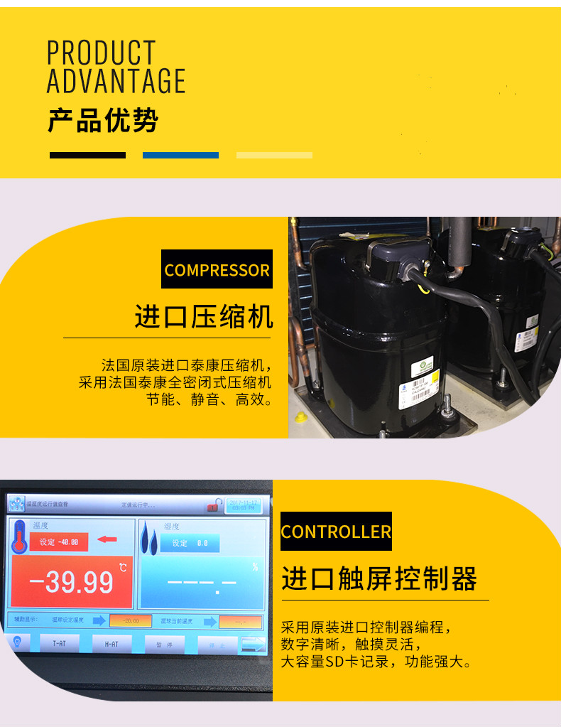 公司經過一步步的發展成長,現已擁有國內一流的生產設備和工藝,先進的多工位進口數控沖床,多臺折彎機、剪板機、車床等設備令生產出的產品工藝更精湛。公司外購件都采用進口知名品牌試驗箱采用進口專用智能型數字化儀表,如日本RKC、韓國宣榮,制冷壓縮機勻采用法國泰康及德國谷輪機。另外,公司正致力于開發專用控制儀表,在設計中融入了計算機控制技術,采用了觸摸屏人機接口,保證了試驗箱更好的性能和方便的操作界面,并且滿足了工業用戶大規模集成控制的要求。