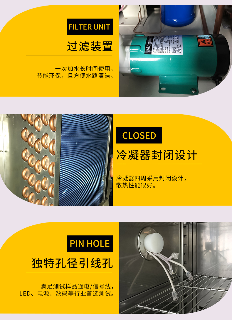 1.高溫低溫濕熱完全獨立系統,采用遠紅外鎳合金高速加溫電熱器;