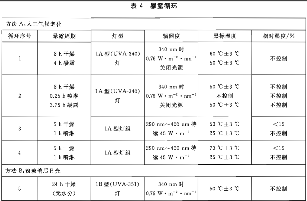表4給出了人工氣候老化(方法A)、窗玻璃后日光(方法B)和2型(UVB-313)燈(方法C)進(jìn)行試驗(yàn)的多組暴露循環(huán)條件。