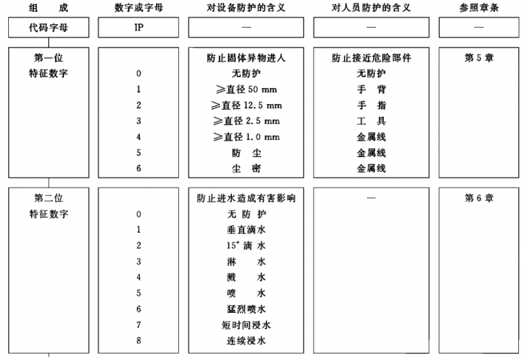 防護等級的細節,特別是第二位特征數字為5/6(噴水)和7/8(潛水)見第6 章。