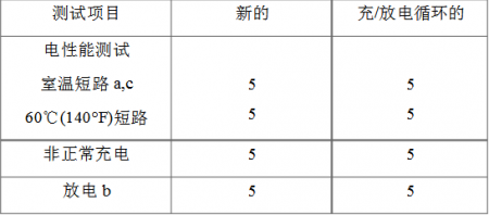 6.2新的二次電芯或電池以及經過充放電循環的二次電芯或電池,按10-19節要求測試,測試樣品數量見表6.2。對用戶可更換的二次電芯和電池測試用樣品數量見表6.4。當一組具有不同尺寸的電芯或電池, 他們采用近似的電化學原理制造,可以選取一個代表尺寸進行測試。